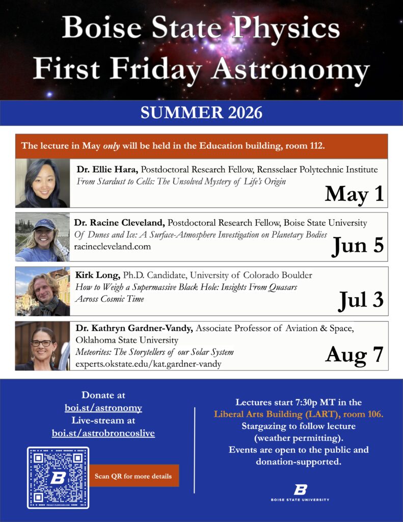Boise State’s First Friday Astronomy Event Schedule for Summer 2026. Our guests will be